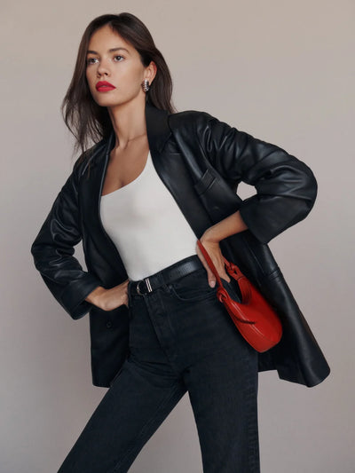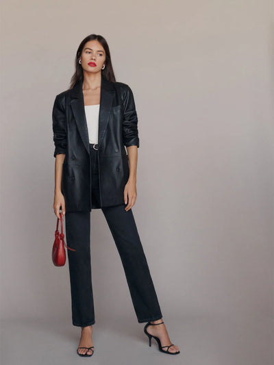 Not too big, not too small, the Dalia Double Breasted Leather Blazer is just right.