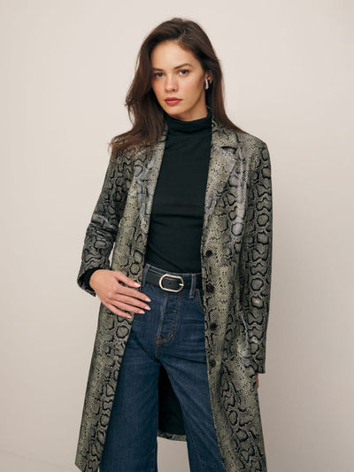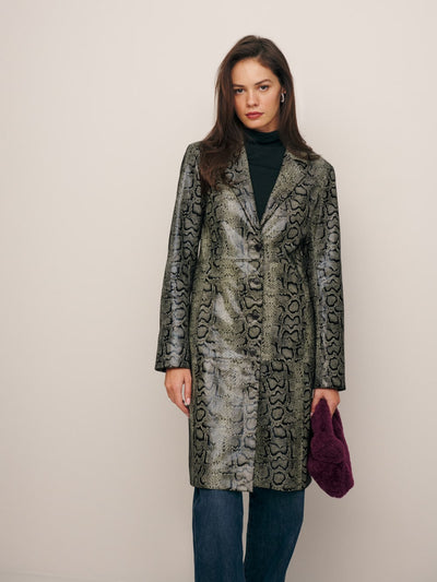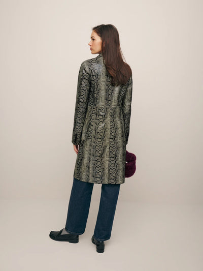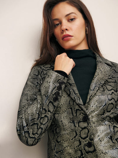 A new version of an old favorite, the Veda Crosby Longline Leather Jacket is now available in a rich, kind of shiny snake printed leather. It's basically a neutral.